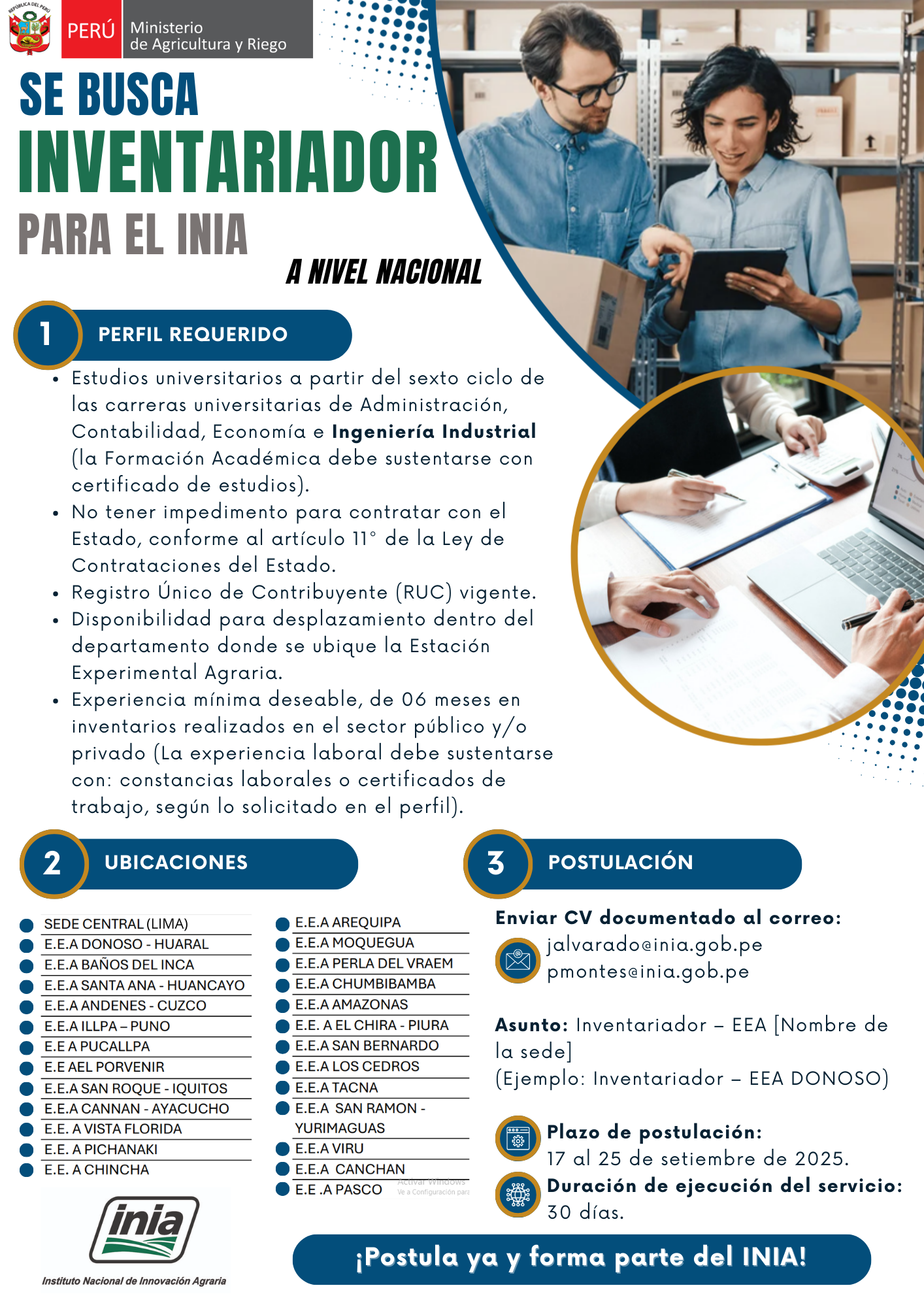 El Ministerio de Desarrollo Agrario y Riego – INIA 🌱 ha iniciado la convocatoria nacional para la Contratación de Inventariadores 📝 en sus 26 Estaciones Experimentales Agrarias 🚜 ubicadas en todo el país.