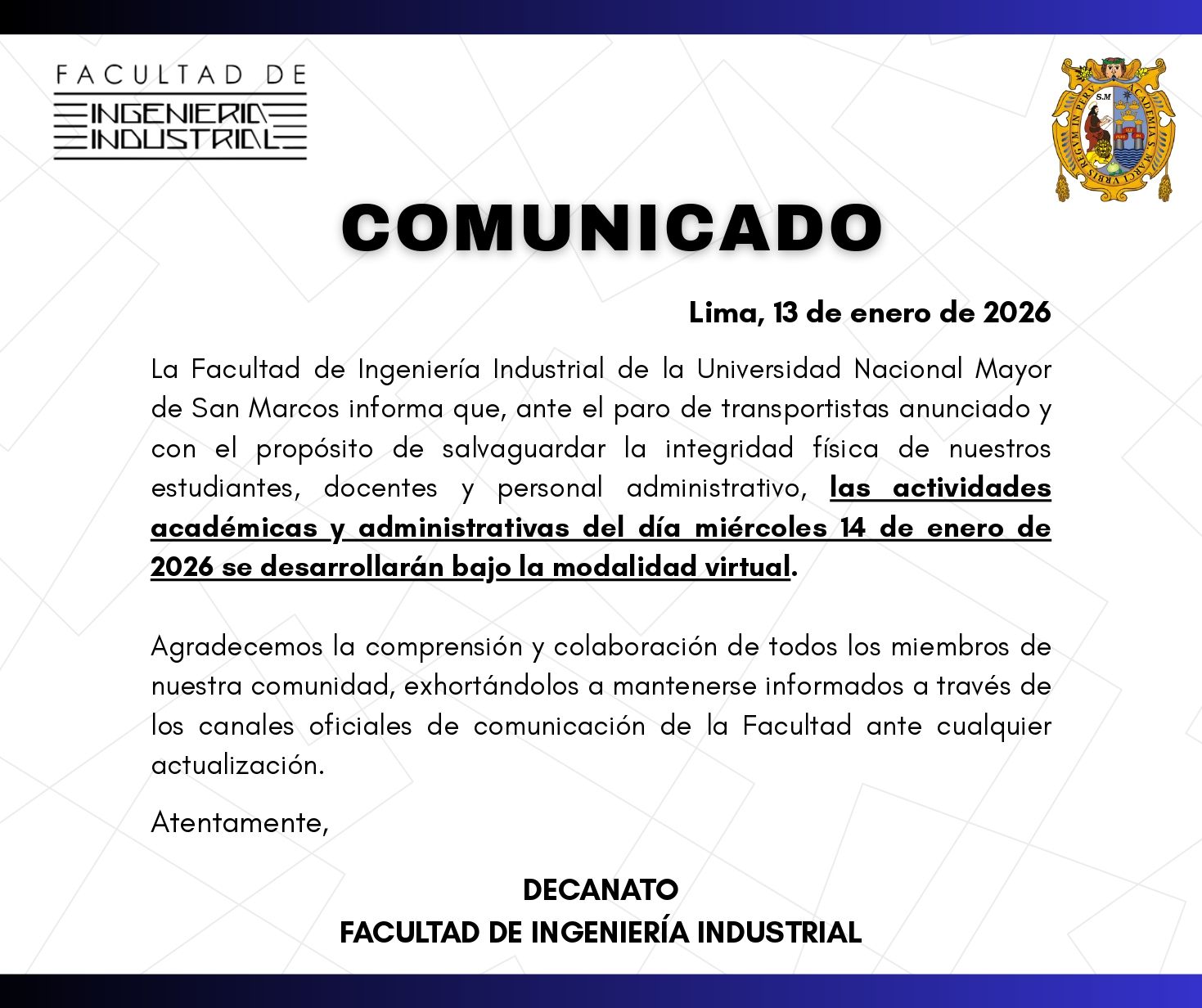 🏛️ La Facultad de Ingeniería Industrial de la UNMSM informa que, ante el paro de transportistas y para proteger la integridad de la comunidad universitaria, las actividades del miércoles 14 de enero de 2026 se realizarán en modalidad virtual.