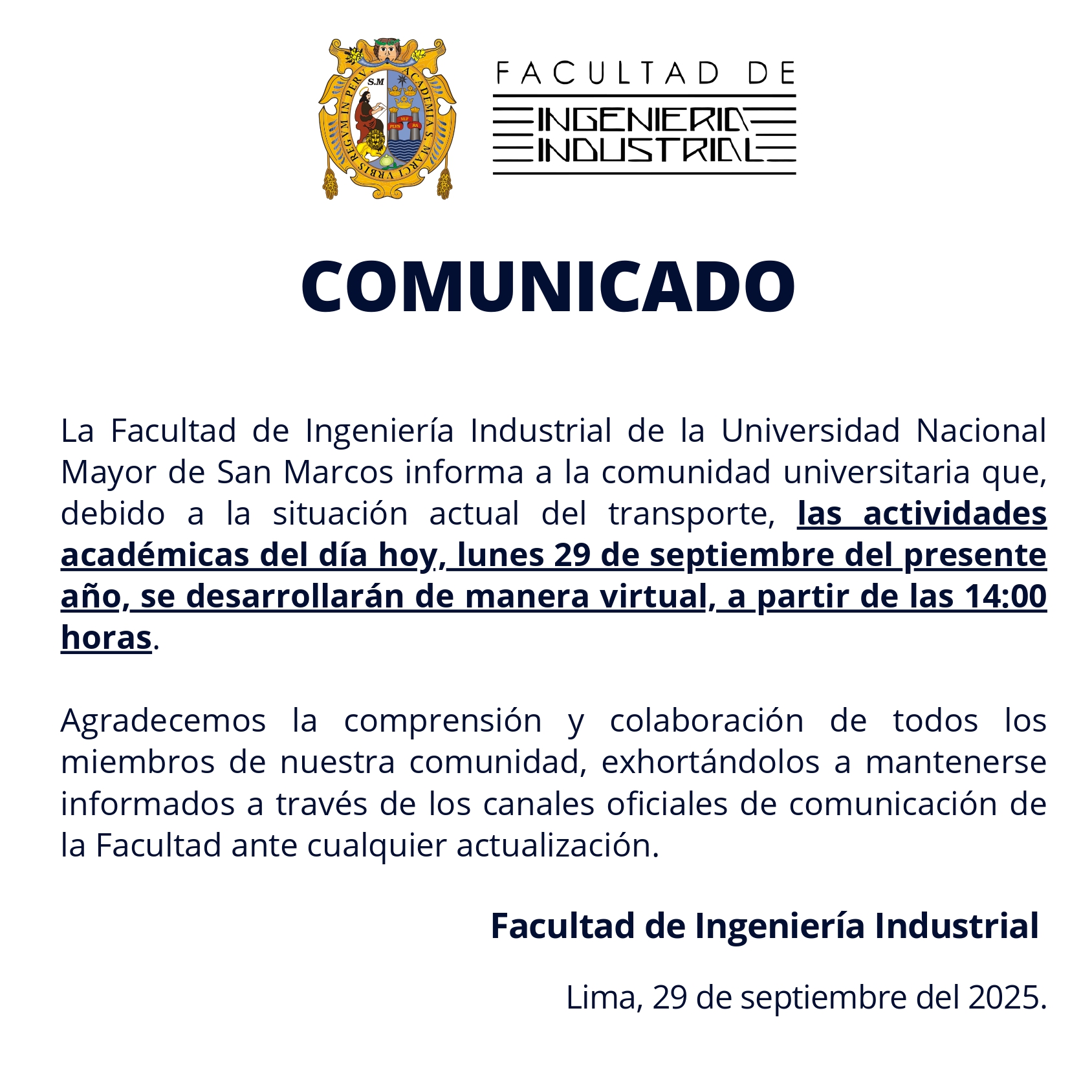 Debido a la situación del transporte 🚍, las actividades académicas de hoy lunes 29 de septiembre se realizarán de manera virtual a partir de las 14:00 horas.