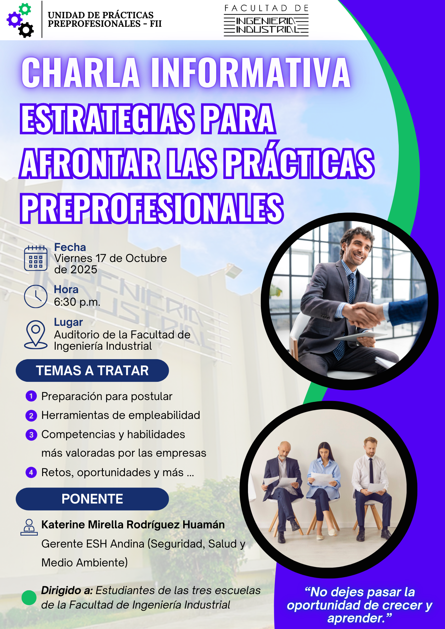 ✨ Recuerda: Las prácticas preprofesionales son un paso decisivo en tu carrera, sobre todo si estás en los últimos ciclos 🚀. Esta charla te dará las herramientas para marcar la diferencia y destacar en el mundo laboral.
