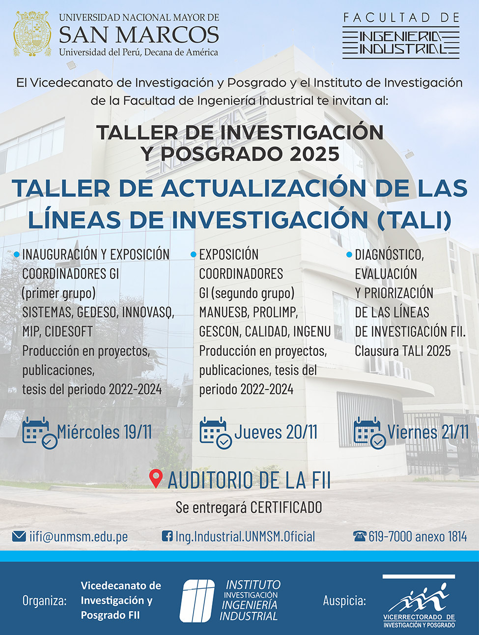La Facultad de Ingeniería Industrial de la UNMSM te invita al Taller de Actualización de las Líneas de Investigación (TALI), un espacio clave para conocer los avances y proyectos de los grupos de investigación.