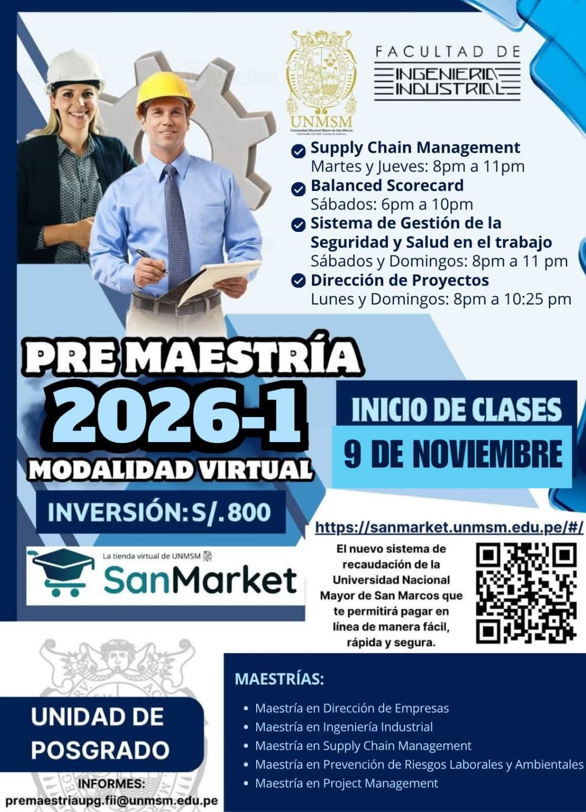 La Unidad de Posgrado de la Facultad de Ingeniería Industrial de la Universidad Nacional de San Marcos impulsa el desarrollo de las instituciones públicas y privadas a través de nuestros programas de maestrías y doctorados de alto nivel, pegándose a las tendencias tecnológicas, sociales, negocios, y de investigación para integrarse a una economía globalizada y enfrentar a un entorno muy competitivo comprendiendo que las instituciones requieren profesionales preparados para tomar decisiones estratégicas y conscientes de los desafíos cotidianos.