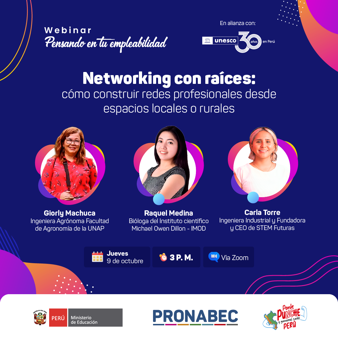 Este jueves 9 de octubre a las 3:00 p. m. acompáñanos en el webinar “Networking con raíces”. Tres profesionales de la UNESCO te contarán cómo potenciar tu futuro profesional desde espacios locales o rurales. 🚀